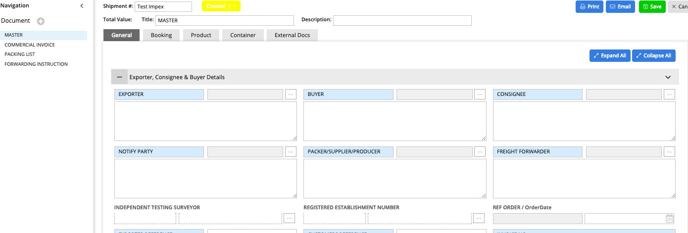 Complete the information of the tabs, General, Booking, Product, Container and save.