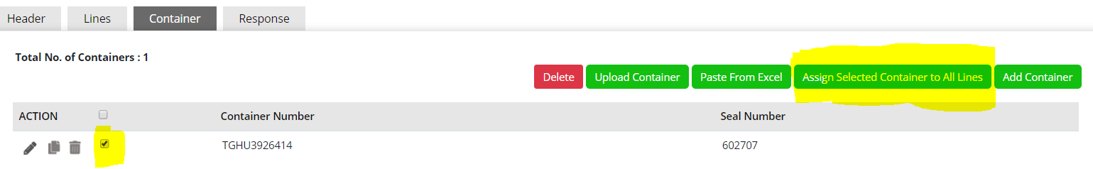 In case, You want to add previously uploaded containers under the Container tab to your Lines then Click on the Assign Containers button as highlighted below, Select container from the list, click on Add Containers to existing list button. Selected Container will be added to the line.