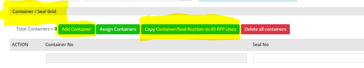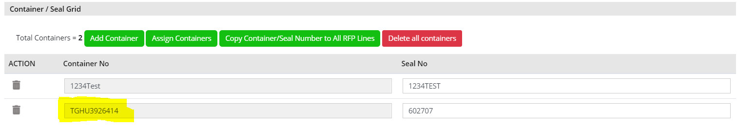 In Lines Tab-->under Packaging, Quantity and Container Details -->under Container/Seal grid, You will find the option to Add Container as highlighted below. From here, you can add a container to your Individual line, Once added can assign the same container to All RFP lines under your RFP. by clicking on Copy container/Seal Number to all RFP Lines button.