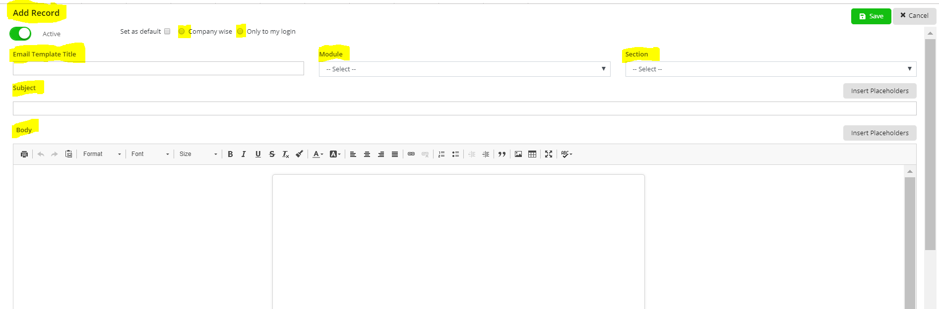 Step 4: After completion, mark template Active and assign visibility (Company wise / Only to my login)