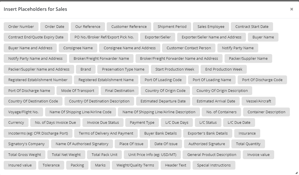Note: Placeholder - Placeholder is a list of data fields available on-screen(SO/PO/Shipment). While creating an email template, You can select the fields by name from the list by clicking on
