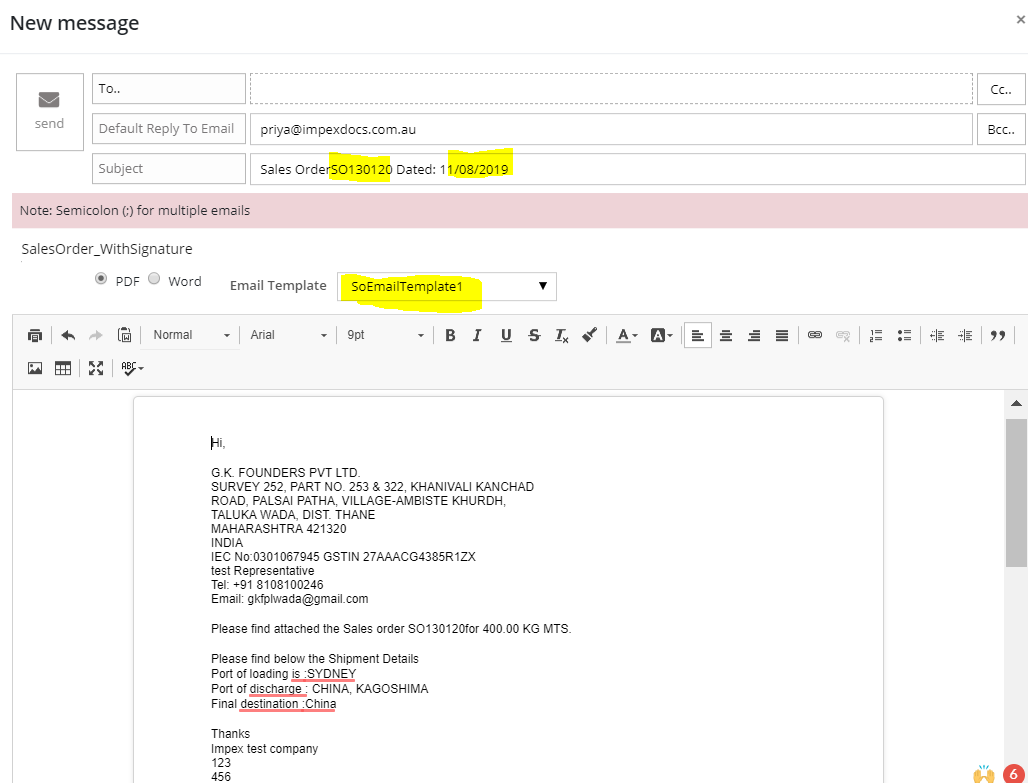 - while sending email from SO, select created email template as shown below, all placeholders will fetch data from SO and populate in the email content.