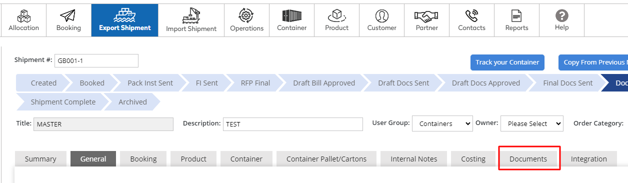 In Export Shipment--> Master-->Documents tab