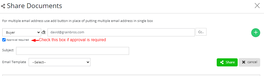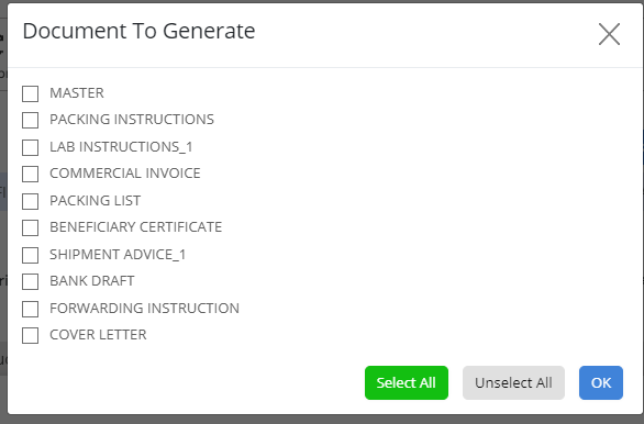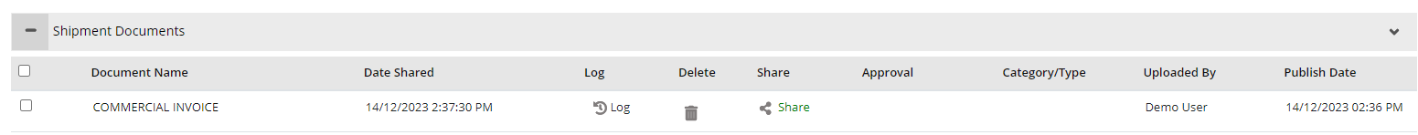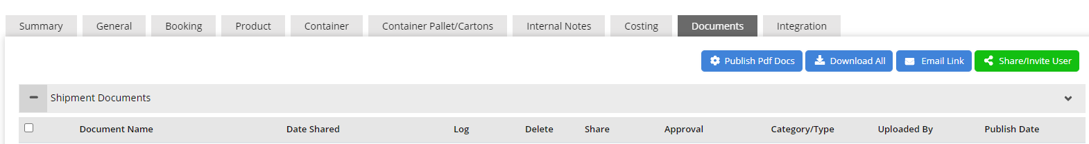 Clicking on the "Publish Pdf Docs" button will open the document list of that shipment. Select the document for which the PDF document to be generated. Once the document is generated you can view date shared, shared information, logs, and Approval details. You can also delete the documents form this section.