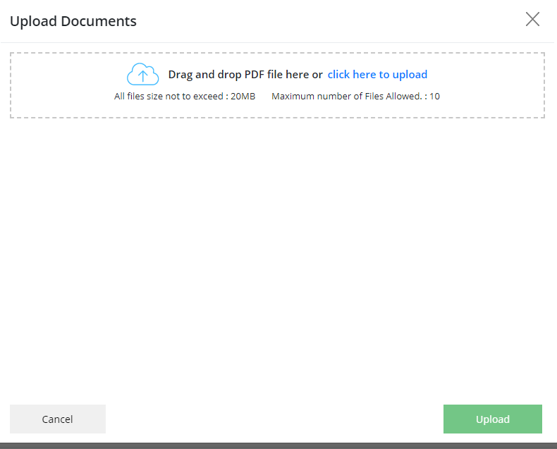 To upload the external document click on the "External Documents" button, select "Click Here To Upload" or "Drag and Drop Files Here" option to upload.