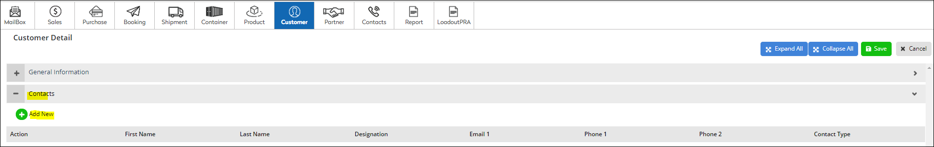 First click on “Customer”, then click on the “+Add” button. This will give you a pop-up to fill Customer details. Now click on the “Contacts” section and click “+Add New” and fill the details accordingly and Save