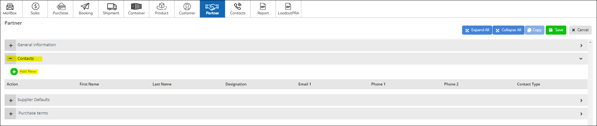 First click on “Partner”, then click on the “+Add” button. This will give you a pop-up to fill partner details. Now click on the “Contacts” section and click “+Add New” and fill the details accordingly and Save.