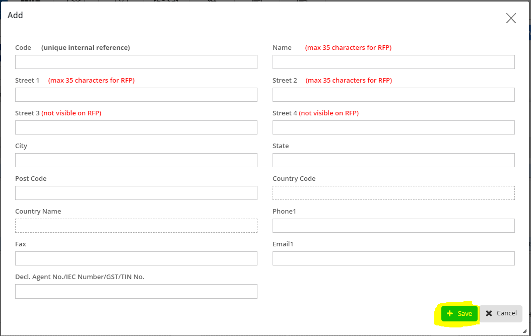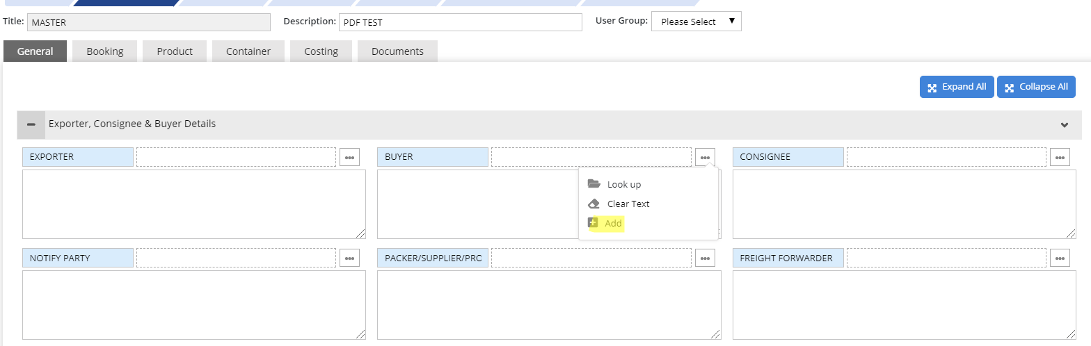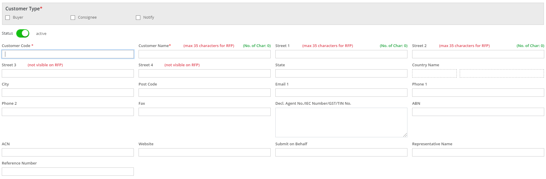 - Click on "..." next to Customer type(Buyer/Consignee/Notify) and click +Add option.