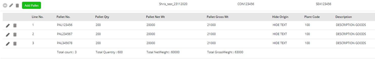 Under the Container Pallet Tab, there are three options available to update the container and pallet details.