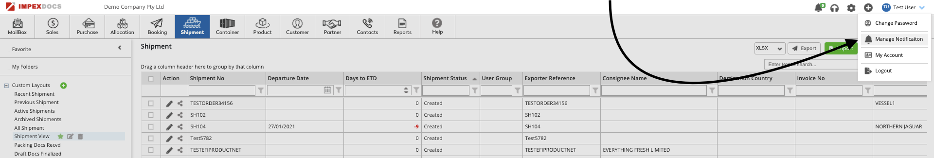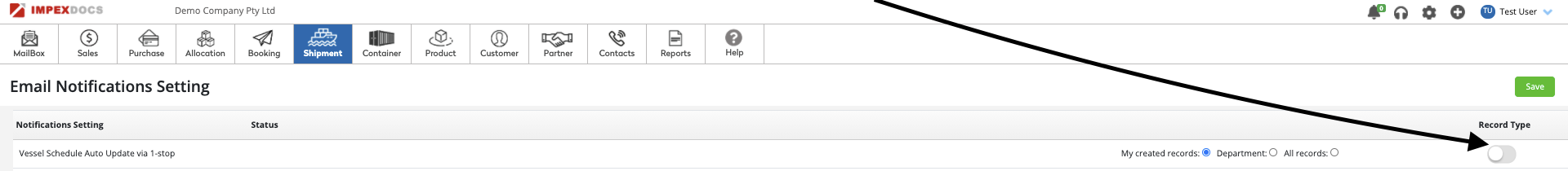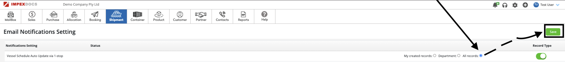 5. Congratulations, you have just turned on all the Vessel Schedule notifications for the records created by you.