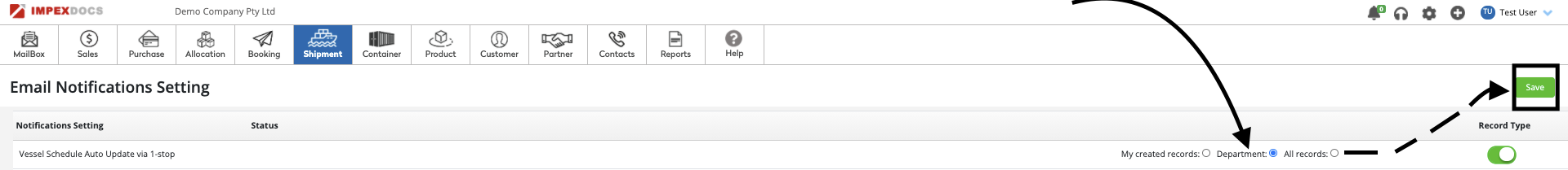 5. Congratulations, you have just turned on all the Vessel Schedule notifications for the records created by your department.