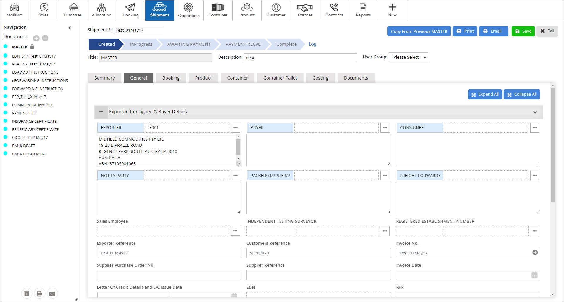 - On the Shipment menu, click Complete Documentation.