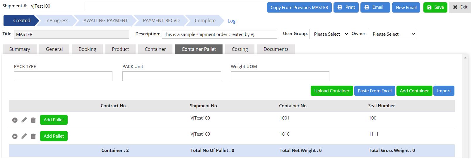 It shows the list of containers and along with buttons to Upload Container, Paste From Excel, Add Container, Import container, and Add Pallet. - Click the Add Pallet button.