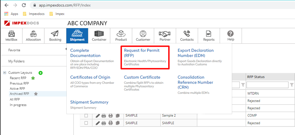 Go to Shipment on the header menu and click on Request for Permit (RFP), to view the REX list.