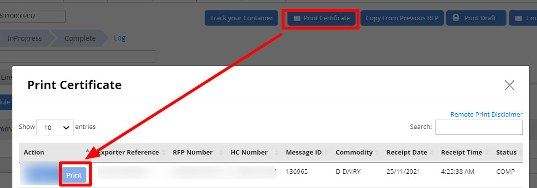 Note- The Certificate will be available only if the REX status is COMP and the Print location is the EDI user number.