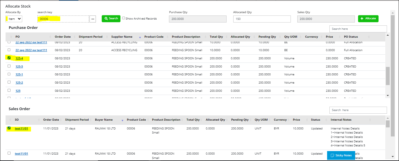 Click on “Allocate Stock”, and a new screen will open as shown below, where all your per-item SOs and POs will be available for the user to allocate from.