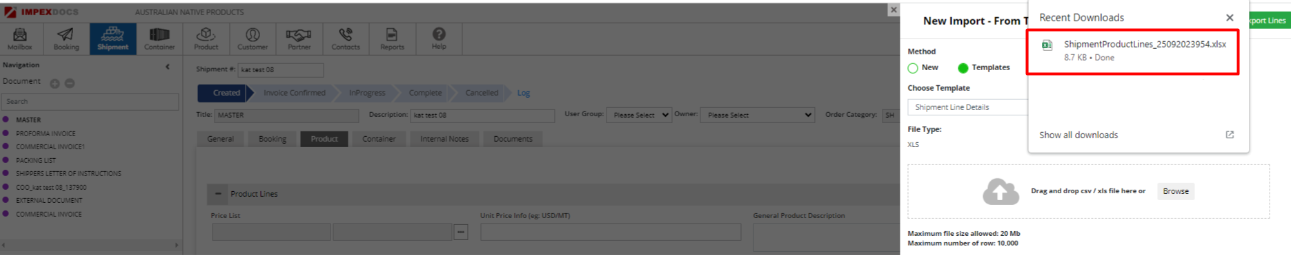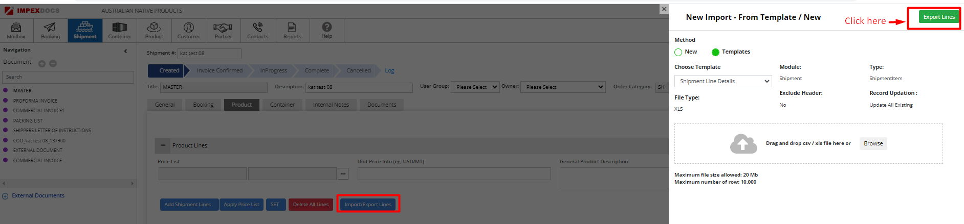 Step 2: Now click on Export lines, to download existing lines in the shipment.