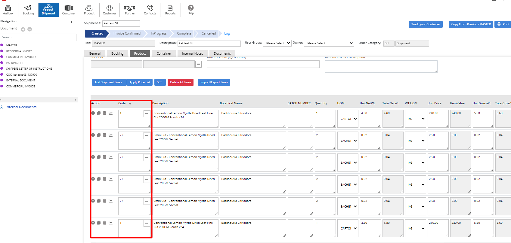 Step 1: Choose an existing shipment > Click on Import/Export Lines